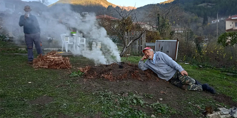 Στην συνέχεια, τα σκέπαζαν με φτέρη και στρώμα χώματος, έτσι ώστε η καύση να είναι ατελής, με ελάχιστη ποσότητα οξυγόνου και διαρκούσε 15 ημέρες. Γι’ αυτό ο κατρανάς, μέρα νύχτα έπρεπε να είναι παρών, να επιτηρεί συνεχώς τη διαδικασία της καύσης.