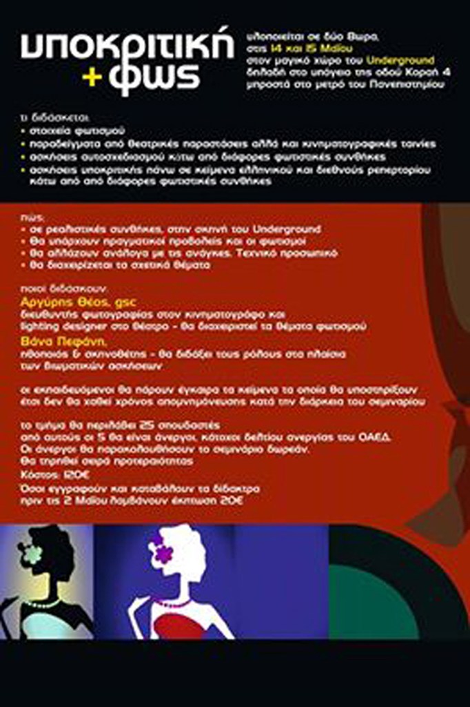 Το «παίξε με το φως» είναι ένα διαφορετικό, βιωματικό σεμινάριο, σε διδασκαλία Αργύρη Θέου και Βάνας Πεφάνη. Απευθύνεται σε ηθοποιούς, χορευτές, τραγουδιστές, σκηνοθέτες και σε όποιον εμπλέκεται με την σκηνική πράξη. Στόχος του να προσεγγίσει με καθαρό και διαφωτιστικό τρόπο την λειτουργία με την οποία όποιος πατά στο σανίδι ενσωματώνει και ενσωματώνεται σε αυτό που τον αγγίζει, τον αγκαλιάζει και εν τέλει τον προσδιορίζει: Το σκηνικό φως.