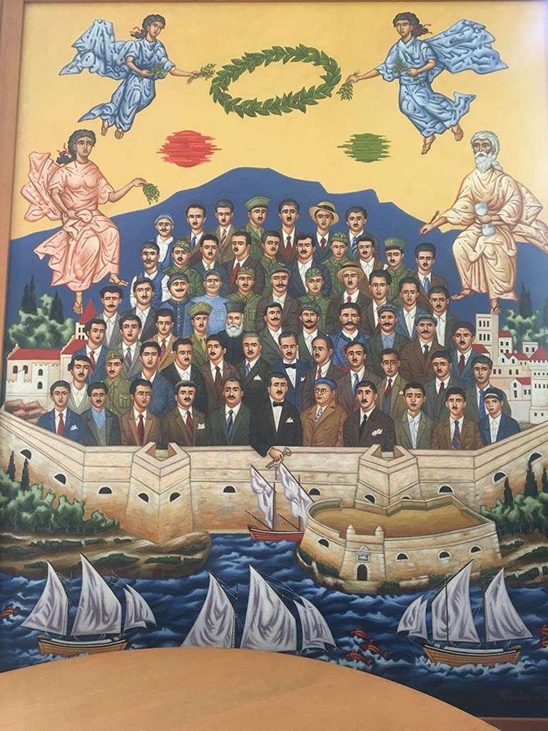 «Νομίζω ότι μια τέτοια προσέγγιση ήταν μέσα στη συλλογιστική του καλλιτέχνη. Να δώσει, δηλαδή, στοιχεία από εκκλησιαστική ζωγραφική. Ο Αριστόδημος Παπαδάκης είναι ένας ζωγράφος που σέβεται πολύ την παράδοση και την τέχνη της παράδοσης και νομίζω ότι ακριβώς επειδή μιλάμε για μαρτυρικές προσωπικότητες, ήταν μέρος της συλλογιστικής του, να τους παρουσιάσει σε ένα πλαίσιο που να θυμίζει εικονογραφία, αγιογραφία, να τους εμφανίζει ως ήρωες-άγιους» πρόσθεσε η κ. Πλεύρη η οποία επισήμανε ότι στόχος είναι αυτός ο πίνακας, με την ολοκλήρωση της μελέτης του εσωτερικού της Πινακοθήκης, να τοποθετηθεί σε εξέχουσα θέση.