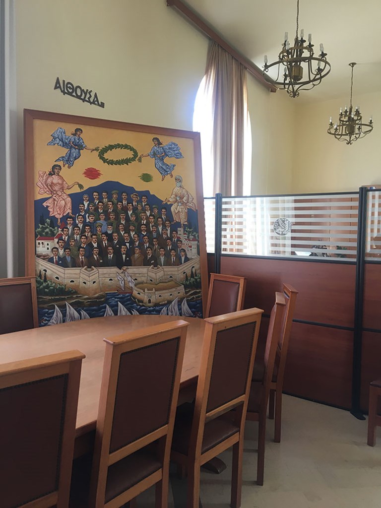 «Είναι ένας πίνακας με μια μακρά και θλιβερή ιστορία, που απεικονίζει τα πρόσωπα των 62 Μαρτύρων, με τον ζωγράφο να βλέπει φωτογραφίες τους για να μπορέσει να αποδώσει τα χαρακτηριστικά τους» είπε η κ. Πλεύρη που σημείωσε ότι η παραγγελία είχε γίνει αρχικά από τον αείμνηστο δήμαρχο Μανώλη Καρέλλη.