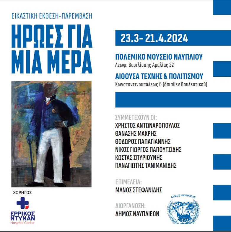 Τίτλος της έκθεσης που επιμελείται ο ομότιμος καθηγητής του Καποδιστριακού Πανεπιστημίου Αθηνών, Μάνος Στεφανίδης και αποτελεί προϊόν συνεργασίας του Πολεμικού Μουσείου και του Δήμου Ναυπλιέων, με τη χορηγία του Νοσοκομείου «Ερρίκος Ντυνάν», είναι «Ήρωες για μία μέρα», καθώς οι δημιουργοί όλων των έργων που παρουσιάζονται σε όσους κατοικούν ή θα επισκεφτούν την ιστορική πόλη της Ελληνικής Επανάστασης αποτίουν, ο καθένας με τον δικό του τρόπο, φόρο τιμής στους Ήρωες του χθες.