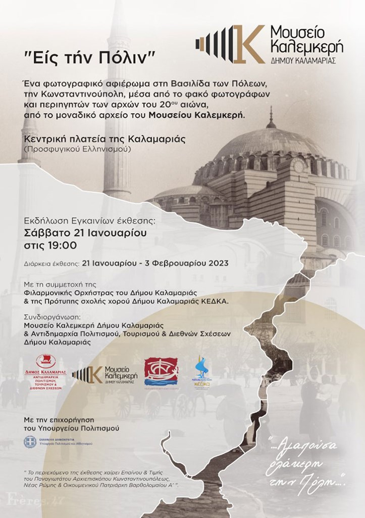 Με μία υπαίθρια έκθεση φωτογραφίας αρχίζει τη νέα χρονιά το Μουσείο Καλεμκερή του Δήμου Καλαμαριάς, την οποία συνδιοργανώνει με την Αντιδημαρχία Πολιτισμού, Τουρισμού και Διεθνών Σχέσεων του Δήμου. Πρόκειται για την έκθεση «Εις την Πόλιν», που είναι αφιερωμένη στην Κωνσταντινούπολη και θα παρουσιαστεί στην κεντρική πλατεία του Δήμου (Προσφυγικού Ελληνισμού), από τις 21 Ιανουαρίου μέχρι και τις 3 Φεβρουαρίου 2023.