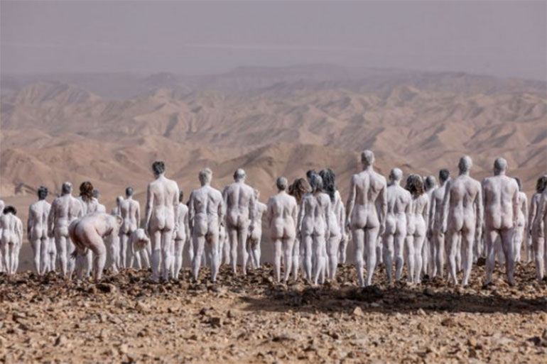 Σχεδόν 200 άνθρωποι πόζαραν γυμνοί, με τα σώματα βαμμένα άσπρα, για τον Αμερικανό φωτογράφο Σπένσερ Τιούνικ, με φόντο τη Νεκρά Θάλασσα, η οποία απειλείται από την ξηρασία.