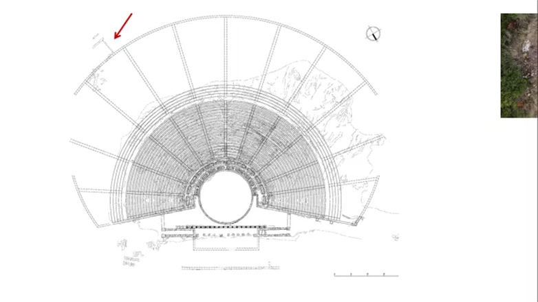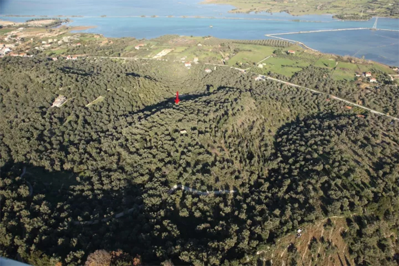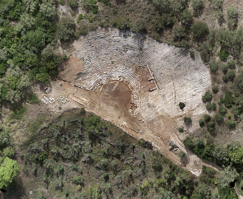 Αριστερά, ο ελαιώνας πριν την έναρξη της ανασκαφής και δεξιά, ο ίδιος χώρος το έτος 2023, όπου πλέον δεσπόζει το αποκαλυφθέν μνημειώδες θέατρο
