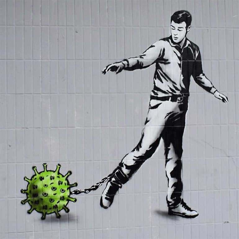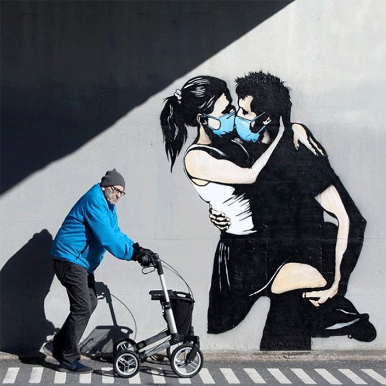 Λόγω της τέχνης τους, πάντα φορούσαν «μάσκες». Σε μια περίοδο που γκαλερί και μουσεία είναι κλειστά, οι δρόμοι είναι ο μοναδικός καμβάς της δημόσιας φαντασίας. Να πώς κάποιοι καλλιτέχνες δρόμου απ’ όλον τον κόσμο «ερμηνεύουν» αυτό που ζούμε.