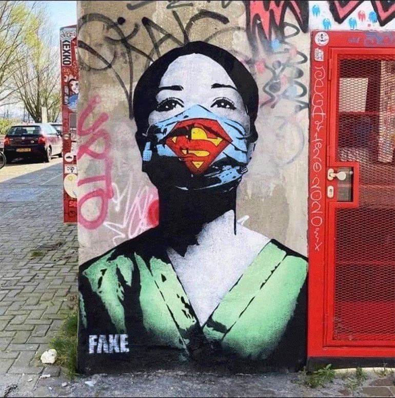 Στο Άμστερνταμ, ο Fake λέει ότι ζωγράφισε τη «Σούπερ Νοσοκόμα» ως ωδή σε όλους τους επαγγελματίες υγειονομικούς σε όλον τον κόσμο.