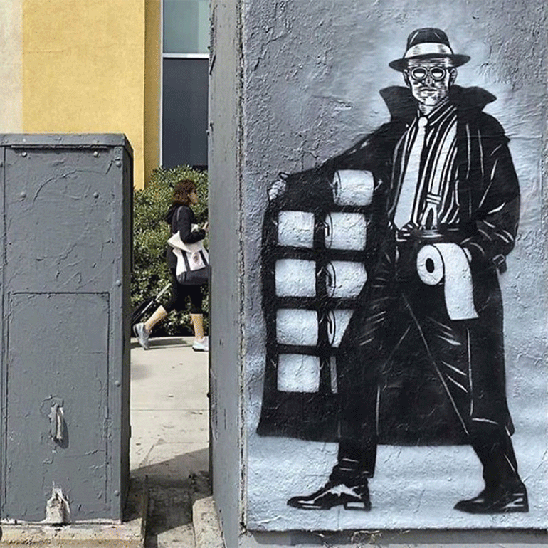 Στο Λος Άντζελες, ο Teachr1 σαρκάζει τη μανία των πανικοβλημένων πολιτών να συσσωρεύουν, τις πρώτες μέρες, χαρτί υγείας.
