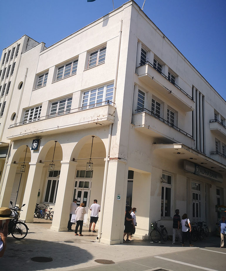Το διώροφο μέγαρο με την χαρακτηριστική ψηλή τοξοστοιχία, στη νότια πλευρά της κεντρικής πλατείας, σύμφωνα με τα παραπάνω στοιχεία, κτίστηκε λίγο μετά τα μέσα της δεκαετίας του 1930 στη θέση ισόγειου καταστήματος, το οποίο στέγαζε το υποκατάστημα της Εμπορικής Τράπεζας από την ίδρυσή του, το 1927.