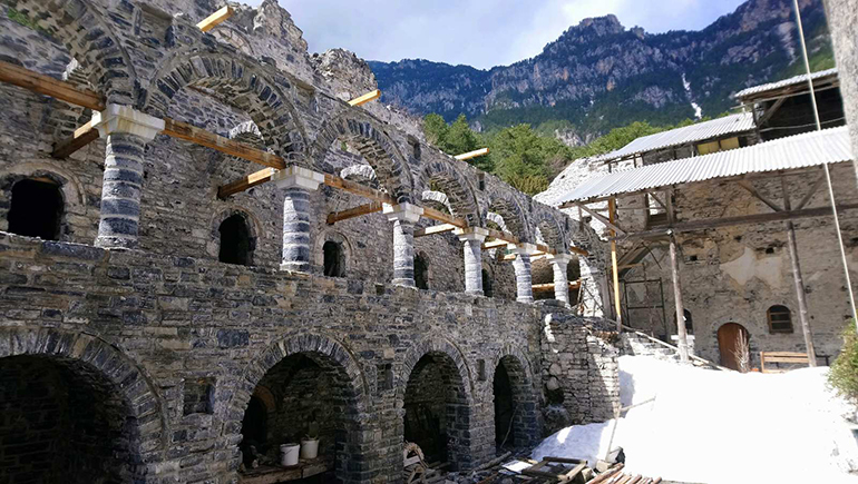 Οι εργασίες αναστήλωσης της κατεστραμμένης παλαιάς μονής του Αγίου Διονυσίου εν Ολύμπω, μέσα στο φαράγγι του Ενιπέα σε υψόμετρο 850 μέτρων, συνεχίζονται με σταθερούς ρυθμούς κάτω από το άγρυπνο μάτι των μοναχών. Ένας ή δύο μοναχοί βρίσκονται συνέχεια ανάμεσα στα ερείπια για να επιτηρούν, να επιβλέπουν τις εργασίες, ενώ κάθε Σάββατο τελείται θεία λειτουργία από τον πατέρα Εφραίμ.