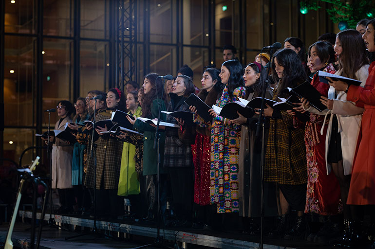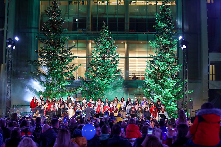 Αρχικά, η Παιδική Χορωδία της Εθνικής Λυρικής Σκηνής, υπό τη διεύθυνση της Κωνσταντίνας Πιτσιάκου, τραγούδησε εορταστικές μελωδίες. Στη συνέχεια, ο Αμερικανός μαέστρος, συνθέτης και καλλιτεχνικός διευθυντής του Young People’s Chorus of New York City, Francisco J. Núñez, μαζί με τις Chórεs της Μαρίνας Σάττι, τις οποίες συνόδευσαν οκτώ αντρικές φωνές και επτά μουσικοί, προσκάλεσαν το κοινό να τραγουδήσει μαζί τους αγαπημένα ελληνικά και ξένα τραγούδια -χριστουγεννιάτικα και μη- δημιουργώντας μια μεγάλη γιορτινή χορωδία.