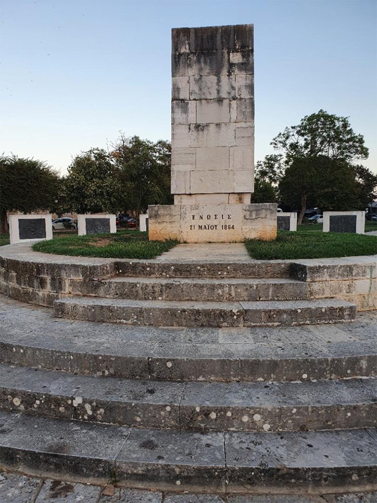 Στο κέντρο του μνημείου, πάνω σε ένα μεγάλο κυκλικό βάθρο, δεσπόζει μία μαρμάρινη στήλη, ύψους περίπου δύο μέτρων, που στην πρόσοψη της αναφέρει «ΕΝΩΣΙΣ 21 ΜΑΪΟΥ 1864».