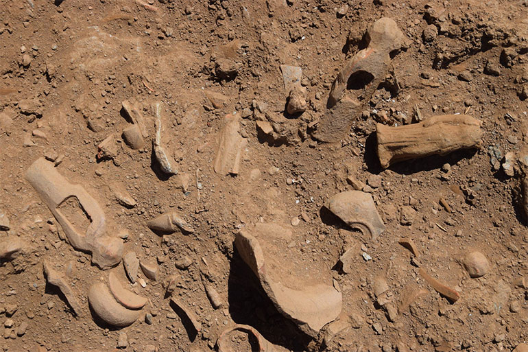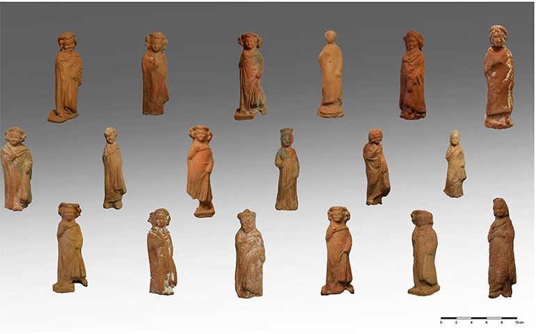 Η ακριβής χρήση και η χρονολόγηση όλων των αποκαλυφθέντων οικοδομημάτων θα προσδιοριστεί όταν θα ολοκληρωθεί η μελέτη των ευρημάτων και των ανασκαφικών δεδομένων. Εν γένει, η έρευνα του εσωτερικού των κτηρίων οδήγησε στην εύρεση πολυάριθμων αναθημάτων. Ο κύριος όγκος προέρχεται ωστόσο από το Κτήριο 3 και από τον «αποθέτη». Συλλέχτηκαν πολλές εκατοντάδες πήλινα αρχαϊκά-ελληνιστικά ειδώλια (τα ακέραια ή σχεδόν ακέραια ξεπέρασαν τα 2000), γυναικεία, και παιδικά. λιγότερα ανδρικά, ιδιαίτερα ηθοποιών και συμποσιαστών, ερμαϊκές στήλες, χοιρίδια, χελώνες, λέοντες, κριοί, πτηνά κ.ά..