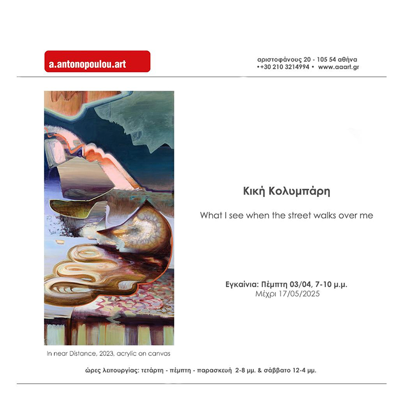 Η αξιόλογη εικαστικός Κική Κολυμπάρη παρουσιάζει στην γκαλερί a.antonopoulou.art την ατομική της έκθεση με τίτλο «What I see when the street walks over me», ως οπτική μιας προσωπικής και βιωματικής διαδρομής εξερεύνησης, όπου ο χώρος και ο χρόνος συμπλέκονται και αποδίδουν με τρόπο ευφάνταστο ένα άρτιο καλλιτεχνικό αποτέλεσμα παρασύροντας τον θεατή σε ένα ταξίδι φαντασίας εφαρμόσιμο όμως και απτό στο εδω και τώρα.