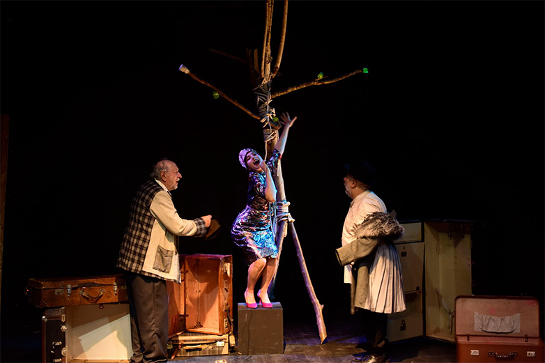 Η σκηνή γίνεται ένα θέατρο μέσα στο θέατρο, γεμάτο μπαούλα, βαλίτσες, ερείπια θεατρικών εποχών και φωτισμούς που δραπετεύουν από τον ρεαλισμό.