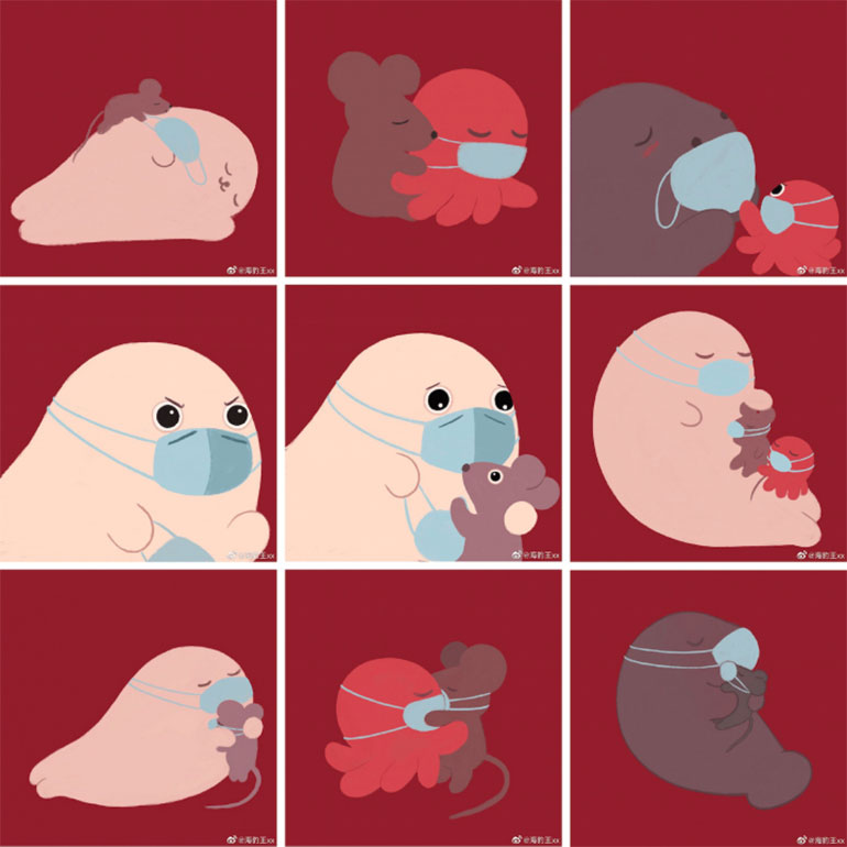 Το κόμικ με την υπογραφή «Wang XX» είναι μια καταπληκτική σύνοψη της τρυφερότητας και φροντίδας που οι κάτοικοι της Κίνας νιώθουν ο ένας για τον άλλον, αυτή την ολέθρια περίοδο: μια φώκια, ένα χταπόδι και ένας ποντικός βοηθούν ο ένας τον άλλον να φορέσει τη μάσκα του.