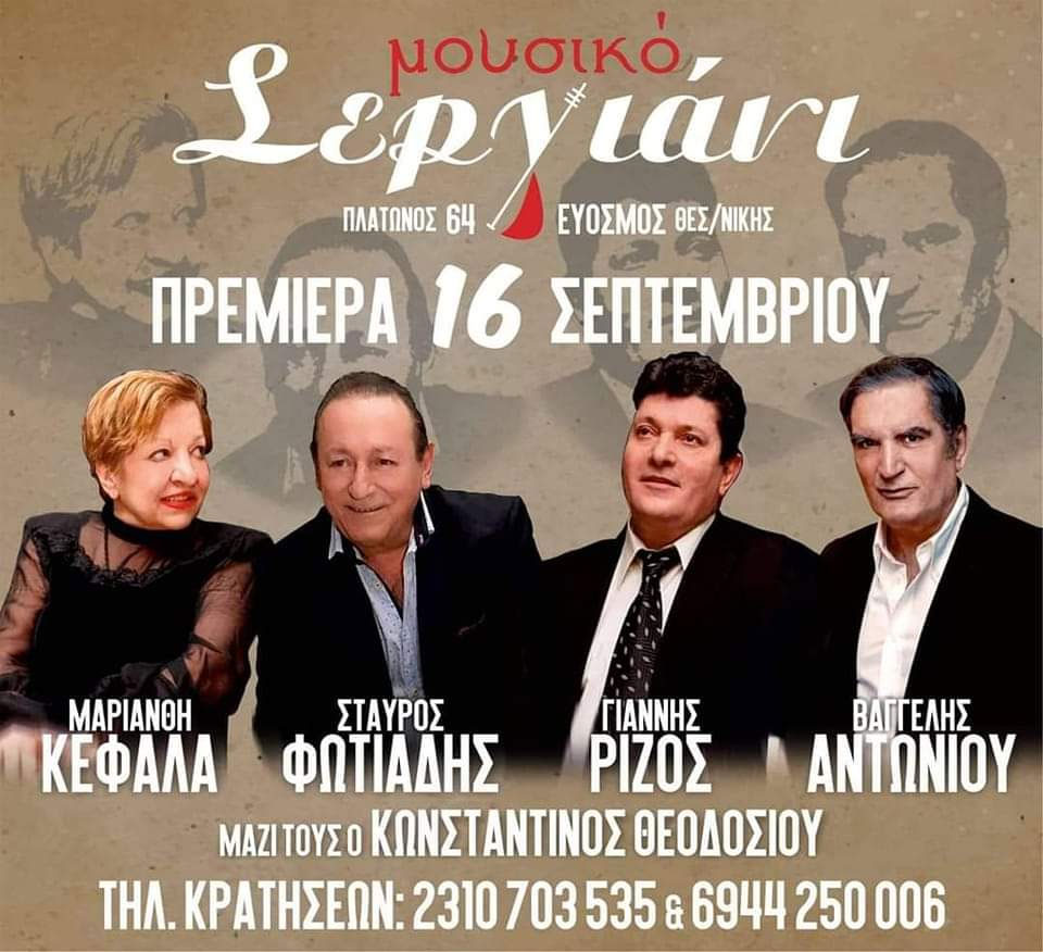 Ο δημοφιλής ερμηνευτής θα εμφανίζεται και αυτή τη σεζόν στο «Μουσικό Σεργιάνι» μαζί με την άλλη σπουδαία φωνή του λαϊκού τραγουδιού, την Μαριανθη Κεφάλα και τους αξιόλογους ερμηνευτές, Γιάννη Ρίζο, Βαγγέλη Αντωνίου και Κωνσταντίνο Θεοδοσίου.