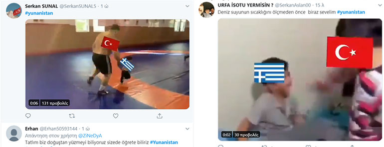 Εικόνες gif που εικονίζουν έναν μεγαλόσωμο παλαιστή (Τουρκία) να κυνηγάει και να πιάνει ένα μικρό παιδάκι (Ελλάδα) ή έναν τύπο (Τουρκία) να σφαλιαρίζει έναν άλλον (Ελλάδα).