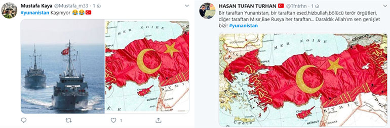 Με πηχυαίες αναρτήσεις συνοδευόμενες από φωτογραφίες που εικονίζουν το ερευνητικό σκάφος Ορούτς Ρέις να πλέει στη Μεσόγειο έχοντας δίπλα του πλοία του τουρκικού Πολεμικού Ναυτικού, γελοιογραφίες και σκίτσα που εμφανίζουν «μικρή» και «δειλή» τη χώρα μας, αλλά και χάρτες της «Μεγάλης Τουρκίας», Τούρκοι χρήστες των social media επιχειρούν έναν «ψυχολογικό» πόλεμο κατά της χώρας μας.