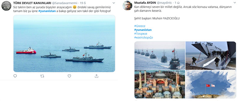 «Πύρινες» αναρτήσεις με φωτογραφίες πλοίων του τουρκικού Πολεμικού Ναυτικού γύρω από Ορούτς Ρέις ή των τουρκικών Ε.Δ. με αναφορά στην κατεχόμενη Κύπρο και στην Αγία Σοφία.