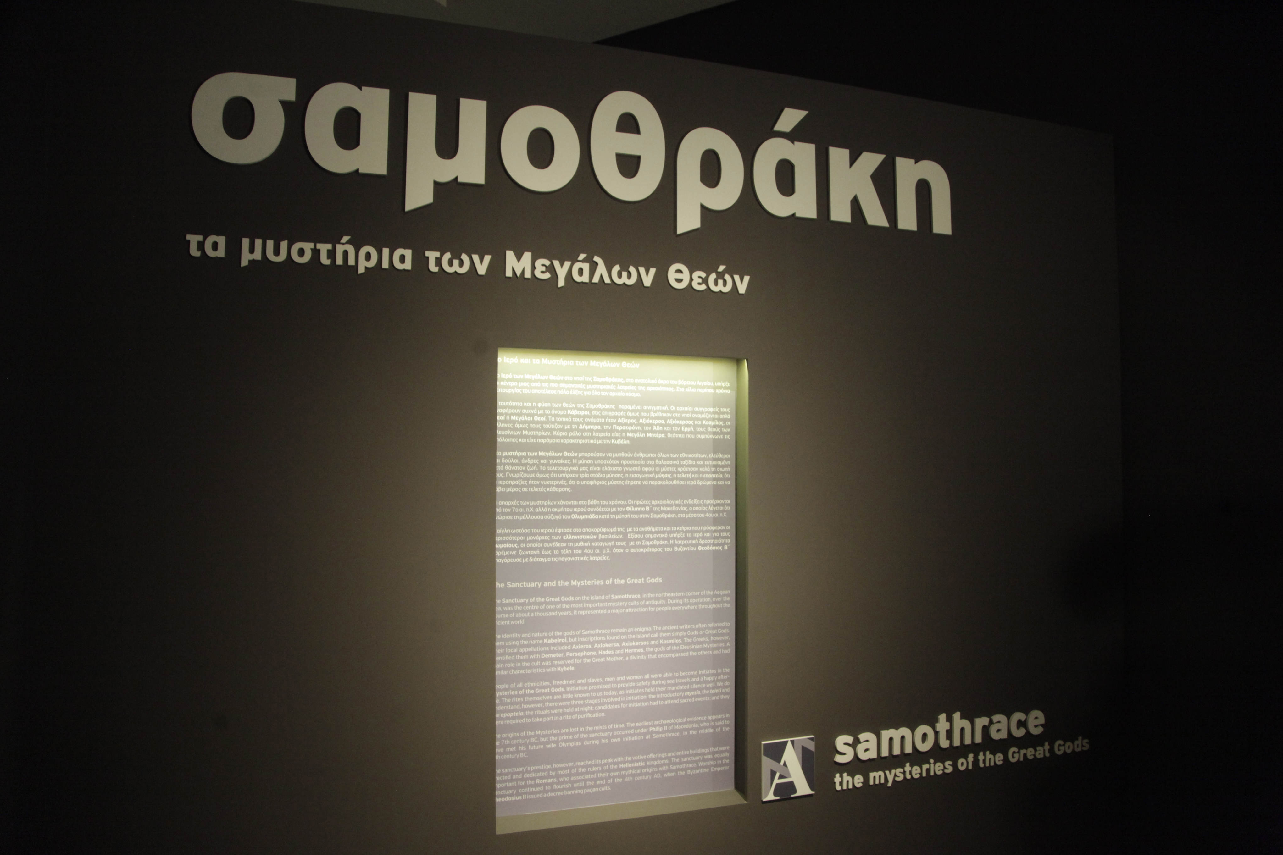 Στην έκθεση, με θέμα τα περίφημα Μυστήρια των Μεγάλων Θεών της Σαμοθράκης, οι οποίοι θεωρούνταν ότι προστάτευαν τους μυημένους από τους κινδύνους της θάλασσας, ενώ οι ίδιοι οι μύστες πίστευαν ότι γίνονταν ευσεβέστεροι και πιο δίκαιοι άνθρωποι, παρουσιάζονται ευρήματα από τις ανασκαφές του Ιερού των Μεγάλων Θεών, της Νεκρόπολης του οικισμού και της μινωικής εγκατάστασης στο Μικρό Βουνί, τα οποία για πρώτη φορά βγαίνουν έξω από το νησί. Παράλληλα σε ψηφιακά βίντεο, υπάρχουν αναπαραστάσεις των ιερών κτηρίων και των μυστηριακών τελετουργιών που γίνονταν, καθώς και εικόνες του φυσικού τοπίου σε ταινία – ντοκιμαντέρ του Κώστα Γαβρά, που προβάλλεται σήμερα για πρώτη φορά.