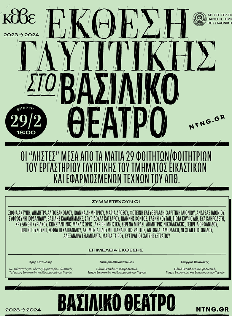 Το Κρατικό Θέατρο Βορείου Ελλάδος σε συνεργασία με το Εργαστήριο Γλυπτικής του Τμήματος Εικαστικών και Εφαρμοσμένων Τεχνών του ΑΠΘ, θα φιλοξενήσει στο Βασιλικό Θέατρο έργα φοιτητών – φοιτητριών, εμπνευσμένα από το κείμενο των Ληστών του Φρίντριχ Σίλλερ. Τα εγκαίνια της έκθεσης γλυπτικής θα πραγματοποιηθούν την Πέμπτη 29 Φεβρουαρίου, στις 18:00 και τα έργα θα παραμείνουν στο Βασιλικό Θέατρο όσο διαρκούν οι παραστάσεις των Ληστών, σε σκηνοθεσία Ακύλλα Καραζήση.