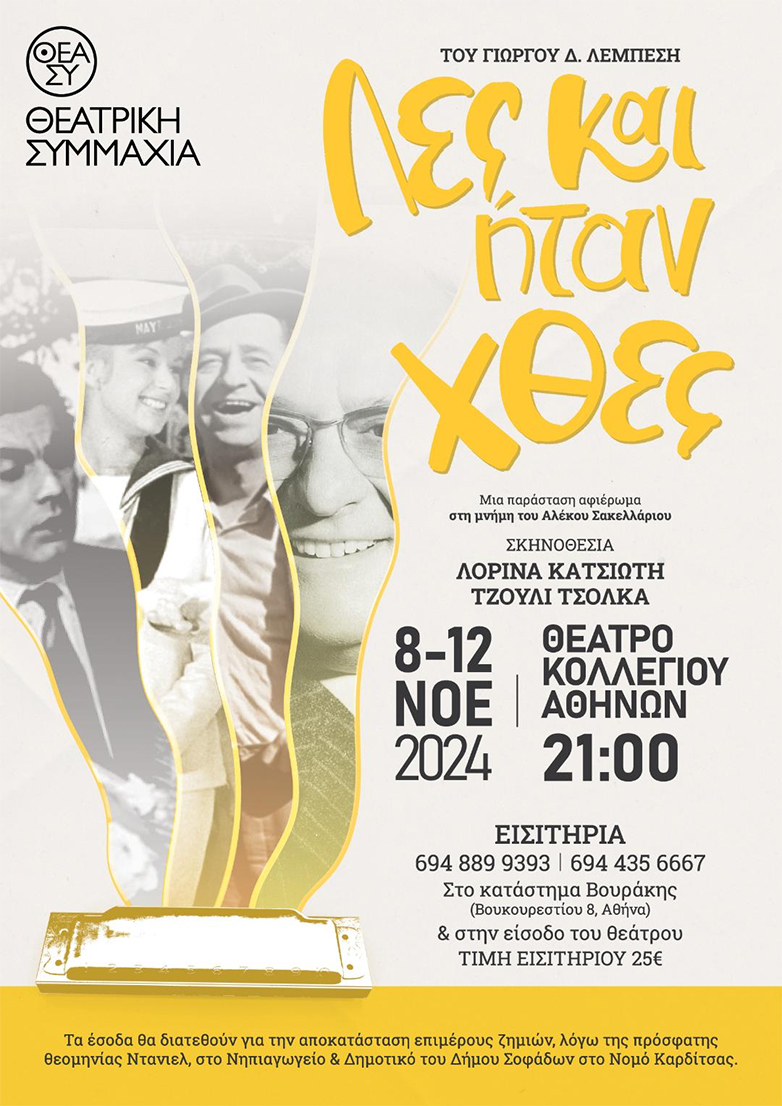 «Λες και ήταν χθες». Μια μοναδική παράσταση αφιέρωμα στη μνήμη του Αλέκου Σακελλάριου, από τη θεατρική ομάδα ΘΕΑ.ΣΥ (Θεατρική Συμμαχία),για έναν σημαντικό σκοπό! Όλος ο κόσμος του κυρ- Αλέκου θα ζωντανέψει επί σκηνής σε μια παράσταση γεμάτη χιούμορ, τραγούδια και συγκίνηση, από την Παρασκευή 8 έως και την Τρίτη 12 Νοεμβρίου, στο Θέατρο Κολλεγίου Αθηνών.