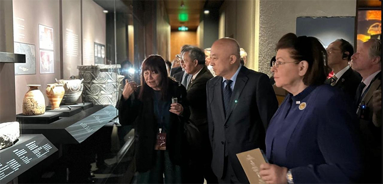 Η Γενική Διευθύντρια του Μουσείου Ηρακλείου ξεναγεί στην έκθεση την Υπουργό Πολιτισμού και τον Γενικό Διευθυντή του Μουσείου του Παλατιού Wang Xudong