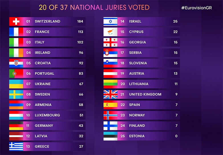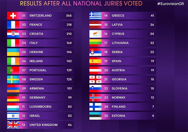 Τα αποτελέσματα των επιτροπών – Η Ελβετία προηγείται με 365 βαθμούς