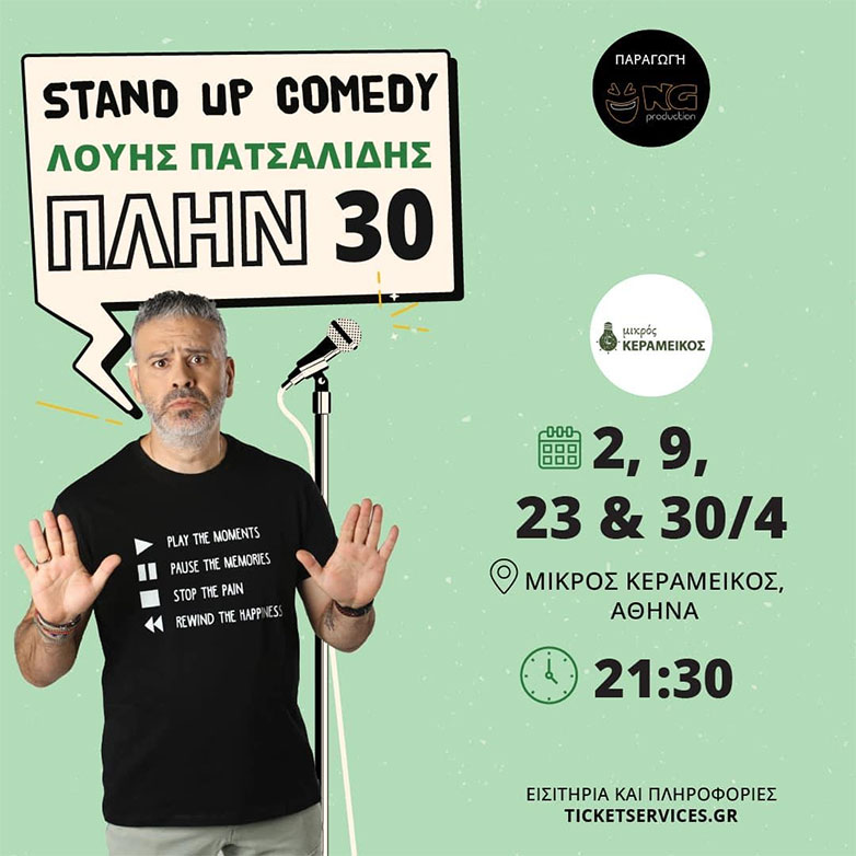 Ο πιο δημοφιλής κωμικός της Κύπρου, και παρουσιαστής του πρώτου σε τηλεθέαση προγράμματος του ΑLΡΗΑ Κύπρου, «Λούης Night Show», Λούης Πατσαλίδης είναι αποφασισμένος ν’ αναστατώσει για ακόμη μια φορά την Αθήνα µε τον υπέρμετρο αυθορμητισμό του και το ολοκαίνουριο solo του, «ΠΛΗΝ 30» για 4 μόνο παραστάσεις, στις 2, 9, 23 και 30 Απριλίου στο Θέατρο Μικρός Κεραμεικός.
