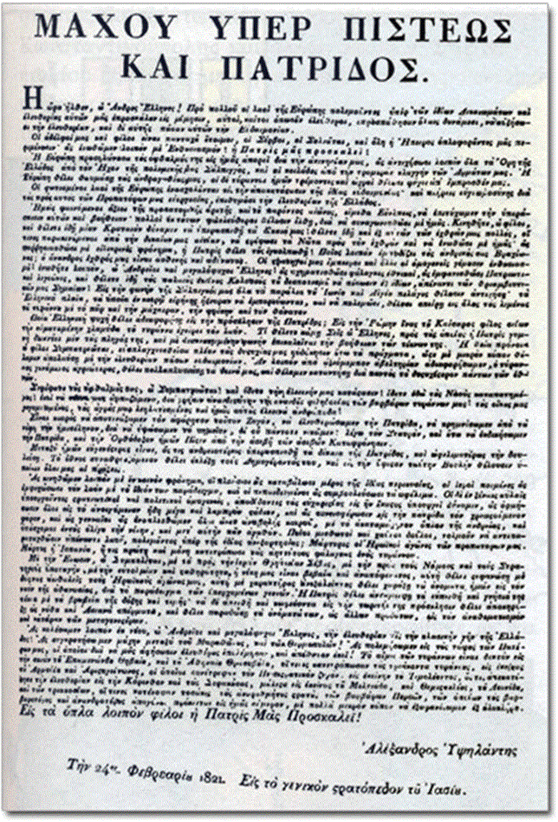 Η ώρα ήλθεν, ω Άνδρες Έλληνες! Προ πολλού οι λαοί της Ευρώπης, πολεμούντες υπέρ των ιδίων Δικαιωμάτων και ελευθερίας αυτών, μας επροσκάλουν εις μίμησιν, αυτοί, καίτοι οπωσούν ελεύθεροι, επροσπάθησαν όλαις δυνάμεσι να αυξήσωσι την ελευθερίαν, και δι’ αυτής πάσαν αυτών την Ευδαιμονίαν.
