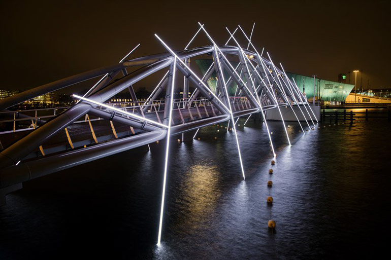 Τα 29 έργα τέχνης που εγκαταστάθηκαν θα είναι αναμμένα από τις 5 το απόγευμα ως τις 11 το βράδυ και την έκθεση – γιατί πρόκειται για μια γιγαντιαία έκθεση με αίθουσα τέχνης το ίδιο το Άμστερνταμ – μπορεί κανείς να την περιδιαβεί είτε περπατώντας, είτε πάνω σε ποδήλατο, είτε με βάρκα.