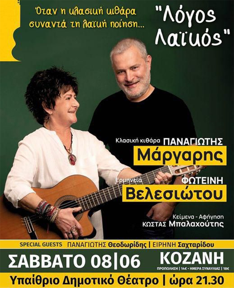 Ο βιρτουόζος κλασικός κιθαρίστας και συνθέτης Παναγιώτης Μάργαρης και η πηγαία ερμηνεύτρια Φωτεινή Βελεσιώτου μας παρουσιάζουν το Σάββατο 8 Ιουνίου, στις 9:30 το βράδυ, στο Υπαίθριο Δημοτικό Θέατρο Κοζάνης, παντοτινά διαμάντια που βασίστηκαν στον λόγο κορυφαίων στιχουργών.