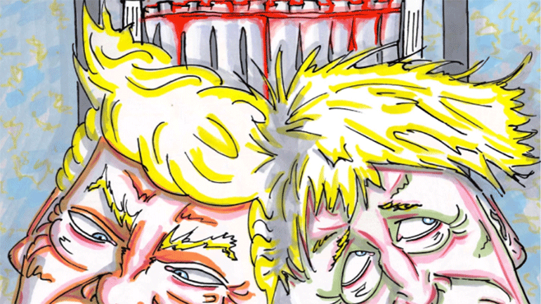 Σε άλλο σκίτσο του που δημοσιεύθηκε την Κυριακή ο ηθοποιός απεικονίζει τον πρόεδρο των ΗΠΑ και τον πρωθυπουργό του Ηνωμένου Βασιλείου, Μπόρις Τζόνσον ως τα τρομερά δίδυμα φαντάσματα της ταινίας «Η Λάμψη» και γράφει «Έλα παίξε μαζί μας».