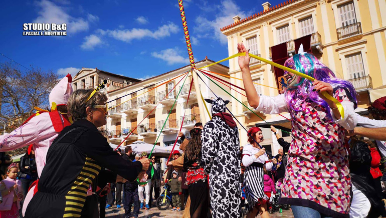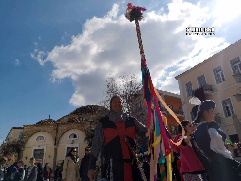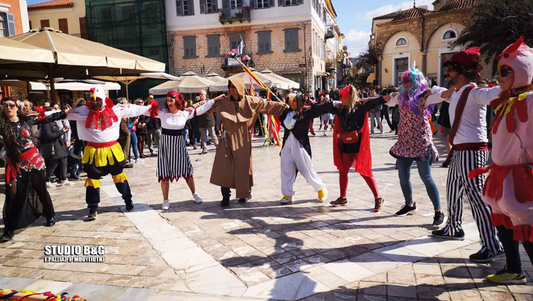 Από την Πλατεία Καποδίστρια, η Χορευτική Ομάδα του Σωματείου « Φίλοι ΠΛΙ», « Το Εργαστήρι Ελληνικού Χορού», ο Πολιτιστικός Αθλητικός Σύλλογος Ναυπλίου «ΧΟΡΟΚΙΝΗΣΗ», το Σωματείο « Το Καστράκι Λαογραφικός Χορευτικός Όμιλος Ασίνης και Αγίας Παρασκευής», ο Σύλλογος Γονέων και Κηδεμόνων Δημοτικού και Νηπιαγωγείου Δρεπάνου, η Χορευτική Ομάδα του Επιμορφωτικού Συλλόγου Αγίας Τριάδας, η Σχολή Χορού Τάτση και η Ομάδα Χορού του 4ου Δημοτικού Σχολείου Ναυπλίου, κρατώντας τα πολύχρωμα γαϊτανάκια τους, χόρεψαν κυκλικά, συμβολίζοντας το πνεύμα της συναδέλφωσης, της αγάπης και της ομόνοιας και τερμάτισαν στην πλατεία Συντάγματος συνεχίζοντας να διασκεδάζουν ντόπιους και επισκέπτες της πόλης.