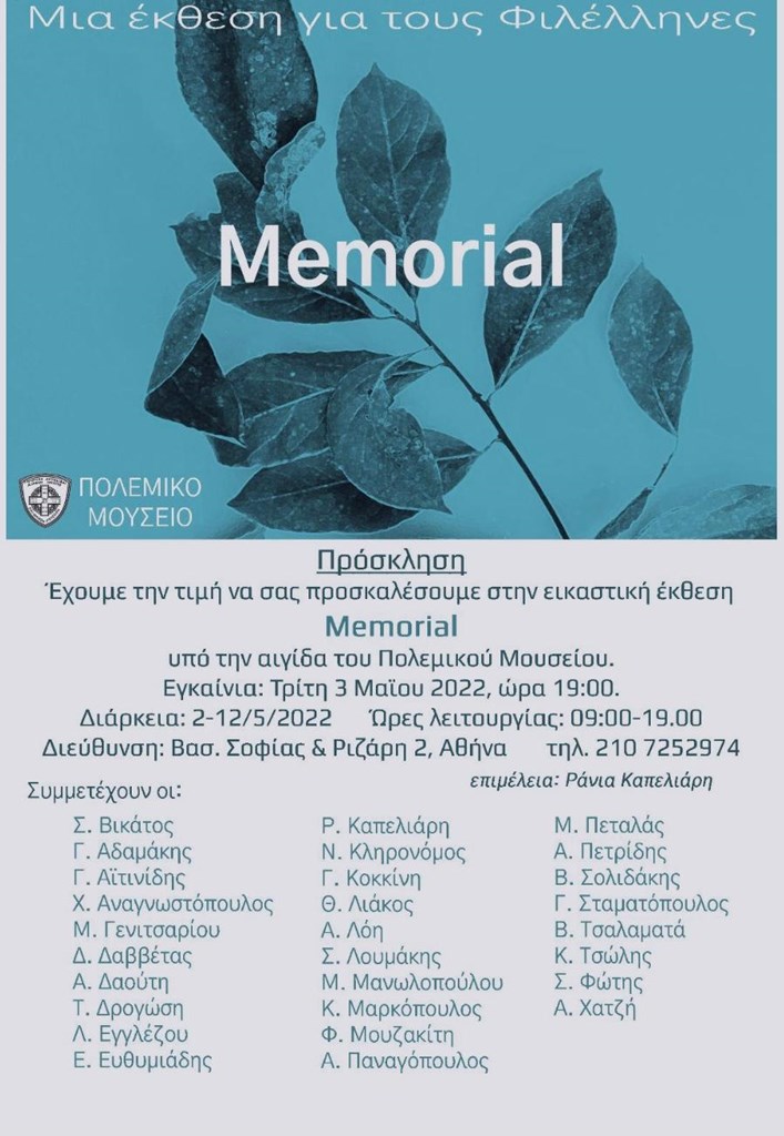Μια εικαστική έκθεση – απόδοση τιμής στους Φιλέλληνες, εγκαινιάζεται σήμερα 3 Μαΐου, στο Πολεμικό Μουσείο της Αθήνας. Τριάντα Έλληνες καλλιτέχνες, με έργα τους αναφέρονται στην συμβολή των Φιλελλήνων στον απελευθερωτικό αγώνα του 1821. Η έκθεση με τίτλο «ΜΕMORIAL, με αφορμή ένα μνημείο για τους Φιλέλληνες», σχεδιάστηκε ως επίλογος μια σειράς αφιερωμάτων και εκθέσεων πάνω στην Εθνική Παλιγγενεσία. Παράλληλα όμως, η έκθεση λειτουργεί και ως αναστοχασμός πάνω στην έννοια του ΧΡΕΟΥΣ προς όσους συμπορεύθηκαν με τους Έλληνες στον δύσκολο αγώνα, μια έκθεση που τιμά την ΜΝΗΜΗ.