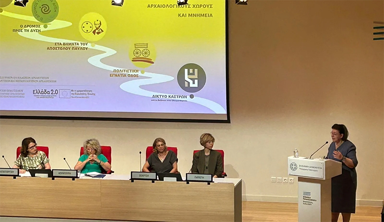 Η Αναπληρώτρια Προϊσταμένη της Διεύθυνσης Βυζαντινών και Μεταβυζαντινών Αρχαιοτήτων Ιουλία Παπαγεωργίου παρουσίασε τις Πολιτιστικές Διαδρομές: «Πολιτιστική Εγνατία Οδός» και «Δίκτυο κάστρων: Από το Βυζάντιο έως την Οθωμανοκρατία».Την ημερίδα χαιρέτησαν ο Γενικός Γραμματέας Πολιτισμού Γιώργος Διδασκάλου, η Γενική Διευθύντρια Αρχαιοτήτων και Πολιτιστικής Κληρονομιάς Ολυμπία Βικάτου.