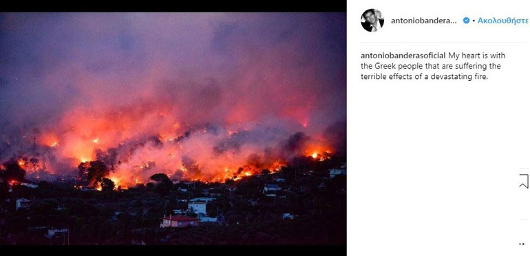 Με ανάρτηση στον προσωπικό του λογαριασμό στο Instagram ο Αντόνιο Μπαντέρας αναφέρθηκε στις φονικές πυρκαγιές στην Αττική και εξέφρασε τη συμπαράστασή του στον ελληνικό λαό. Συγκεκριμένα δημοσίευσε μια φωτογραφία από τις πυρκαγιές στην Ανατολική Αττική και έγραψε στα αγγλικά όσο και στα ισπανικά: