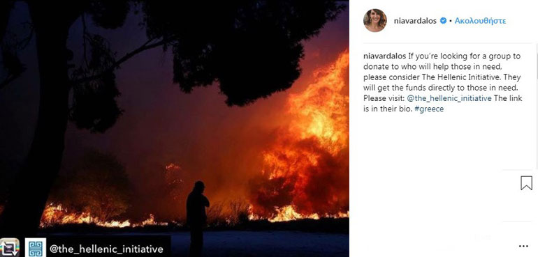 Η ελληνικής καταγωγής ηθοποιός, Νία Βαρντάλος ποστάρει συνεχώς φωτογραφίες στο Instagram από την καταστροφή στο Μάτι αναφέροντας που μπορούν όσοι επιθυμούν να προσφέρουν κάποιο χρηματικό ποσό για τους πληγέντες των καταστροφών.