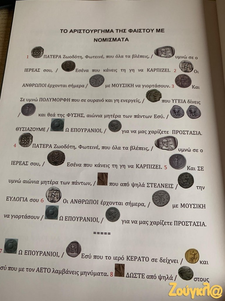 Ακολουθώντας την ερμηνεία που ο ίδιος έδωσε στα σύμβολα του δίσκου, σε σειρά, κατά τον ίδιο το τελικό αποτέλεσμα είναι ένας ύμνος! Αυτή η εκδοχή, που αποτελεί την προσωπική εκτίμηση του νομισματολόγου φυσικά, δεν ταυτίζεται με την επίσημη θεώρηση ότι αυτά που αναγράφονται στον Δίσκο της Φαιστού αποτελούν μια λογιστική καταγραφή.