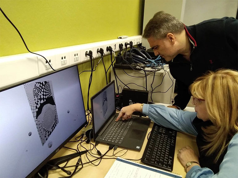 Η εμπειρία της είναι μάλιστα τόσο «ζωντανή» και εμβυθιστική, που όταν ο τεχνητός διάδρομος πάνω στον οποίο περπατάει τόση ώρα ξαφνικά τελειώνει, αισθάνεται ανασφάλεια να συνεχίσει να κινείται, σαν να έχει μπροστά της ένα κενό με άγνωστο βάθος. Στην πραγματικότητα όμως, βρίσκεται όλη την ώρα σε ένα μεγάλο «δωμάτιο» στη Σίνδο, στα δυτικά της Θεσσαλονίκης, και συγκεκριμένα στις εγκαταστάσεις του Τμήματος Μηχανικών Περιβάλλοντος του Διεθνούς Πανεπιστημίου Ελλάδος (ΔιΠαΕ), εκεί όπου έχει δημιουργηθεί ένα παγκοσμίως πρωτοποριακό εργαστήριο εικονικής πραγματικότητας, βασισμένο σε πρώτη φάση σε έργα της Θεσσαλονικιάς καλλιτέχνιδας Εύης Κυρμακίδου.