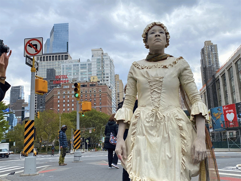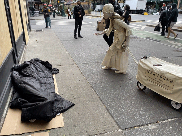 Την περασμένη Τρίτη, ανήμερα των προεδρικών εκλογών στις ΗΠΑ, η καλλιτέχνις Dragonfly τίμησε στη Νέα Υόρκη την κληρονομιά που άφησε η Ona Maria Judge Staines, η οποία δραπέτευσε το 1796 από τη σκλαβιά στην οικία του Τζορτζ Ουάσινγκτον και της συζύγου του, Μάρθα. Η περφόρμανς ξεκίνησε από το Seneca Village και κατέληξε στο Manhattan Trump Hotel.