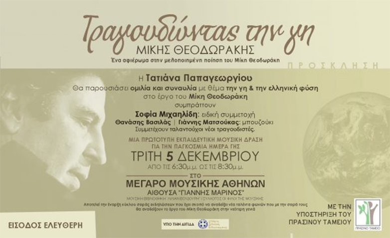 Σήμερα (Τρίτη 5 Δεκεμβρίου 2023) θα πραγματοποιηθεί μια πρωτότυπη εκπαιδευτική και μουσική δράση στην αίθουσα «Γιάννης Μαρίνος», Σύλλογος οι Φίλοι της Μουσικής, στη Μουσική Βιβλιοθήκη «Λίλιαν Βουδούρη» του Μεγάρου Μουσικής Αθηνών όπου βρίσκεται και το αρχείο του Μίκη Θεοδωράκη, με τίτλο «Μίκης Θεοδωράκης Τραγουδώντας τη Γη».