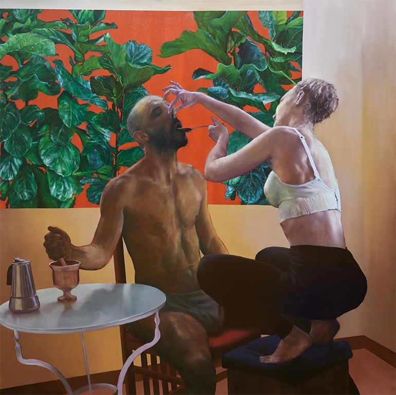 Έτσι εξελίσσονται τα παιχνίδια του Μπαργιώτα ο οποίος φροντίζει να ανοίγει παντού ερμηνευτικές οπές και να μας προκαλεί, να μας ερεθίζει να κοιτάξουμε όχι τα έργα του αλλά μέσα στα έργα του και πίσω από αυτά, να τα φανταστούμε στο βάθος του χρόνου, στο πριν και στο μετά, στην επέκταση του χώρου, πέρα από τους περιορισμούς των καδραρισμένων πλαισίων και των εξεζητημένων στάσεων της πρώτης θέασης και ανάγνωσης. Ως ζωγράφος πάνω απ’ όλα επιλέγει να ζωγραφίσει με την κλασική σημασία της ζωγραφικής. Αλλά οι πίνακές του συμπαρατιθέμενοι και ιδωμένοι εν συνόλω συνθέτουν μια μεγαλύτερη αφήγηση, γίνονται σελίδες από κόμικς που μπορεί να διαβαστεί και με τυχαία σειρά βγάζοντας νόημα. Ακόμα και οι ίδιοι οι πίνακες, μεμονωμένα, αποκαλύπτουν αφηγήσεις και θέτουν αινίγματα με πολλαπλές απαντήσεις. Όπως το Hybrid Faith με τον νοερό τεμαχισμό του υβριδικού «ιερού ναού» σε δύο μέρη: το ένα προορισμένο για την θρησκευτική τελετουργία, την πνευματική λατρεία και το προσκύνημα των εικόνων και το άλλο ως sex doll factory, για τη λανθάνουσα λατρεία του πλαστικού σώματος και τις υποσχέσεις μιας πολυπόθητης σωματικής επαφής και εκτόνωσης. Για να παίξει (με) αυτή την υβριδική ζωγραφική ο Μπαργιώτας μας παραπλανά εκκινώντας από αναγνωρίσιμες εικόνες και στάσεις της Αναγέννησης, αξιοποιώντας τη θεατρικότητα και την επιτήδευση του φλαμανδικού μπαρόκ, θαυμάζοντας το πνεύμα του ρομαντικού Υψηλού. Πάντα, όμως, για να ανατρέψει τη βλοσυρότητα στις πολυπρόσωπες συνθέσεις του φέρνοντας στο νου τα έργα της Paula Rego και προσθέτοντας λεπτομέρειες μαγικού ρεαλισμού όπως τόσο επιτυχημένα κάνει ο Τάσος Μισούρας, για να αναφέρουμε τα ονόματα δυο κατεξοχήν ζωγράφων των οποίων το έργο δηλώνει ότι τον συναρπάζει.