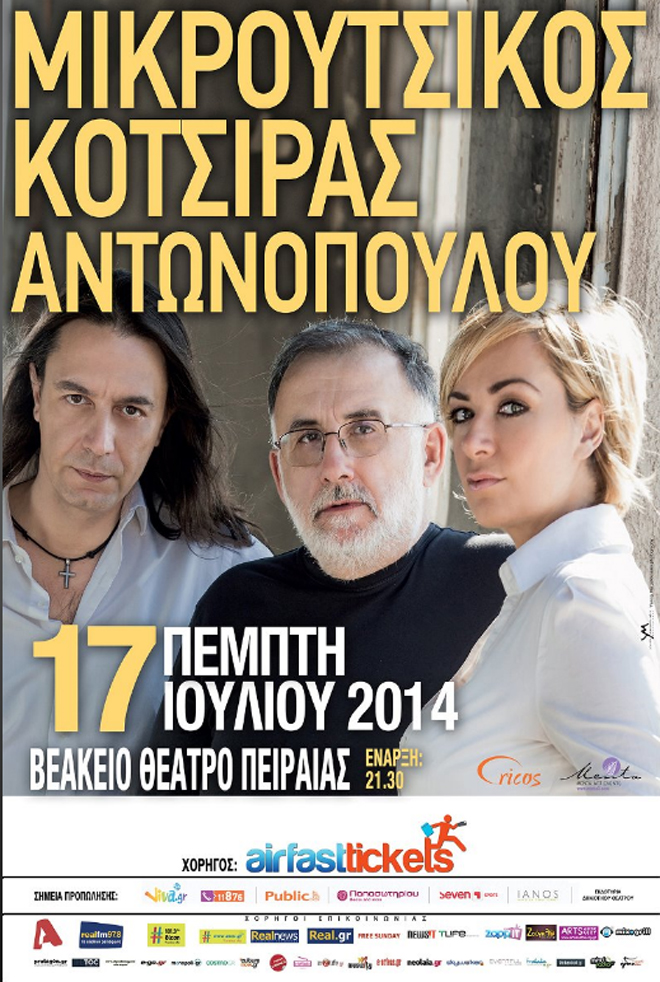 Μετά την μεγάλη επιτυχία και την εντυπωσιακή υποδοχη του κοινού στο κατάμεστο Θέατρο Πέτρας, ο Θάνος Μικρούτσικος, ο Γιάννης Κότσιρας και η Ρίτα Αντωνοπούλου ανανεώνουν το ραντεβού τους την Πέμπτη 17 Ιουλίου σε άλλη μια καλοκαιρινή συναυλία στο Βεάκειο Θέατρο Πειραιά!