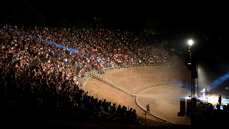 Ένα ενθουσιώδες και γεμάτο θεατές αρχαίο θέατρο, τραγούδησε και συνομίλησε μαζί του, τραγούδια για τον έρωτα, την κοινωνία, τη ζωή, τις σχέσεις των ανθρώπων, τραγούδια σταθμούς που έγραψαν τη δική τους ιστορία.
