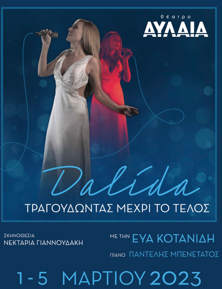 Η μουσικοθεατρική παράσταση «Dalida. Τραγουδώντας μέχρι το τέλος», θα ανέβει στο θέατρο Αυλαία από 1 έως 5 Μαρτίου, Τετάρτη και Κυριακή στις 20:00, Πέμπτη, Παρασκευή και Σάββατο στις 21:15.