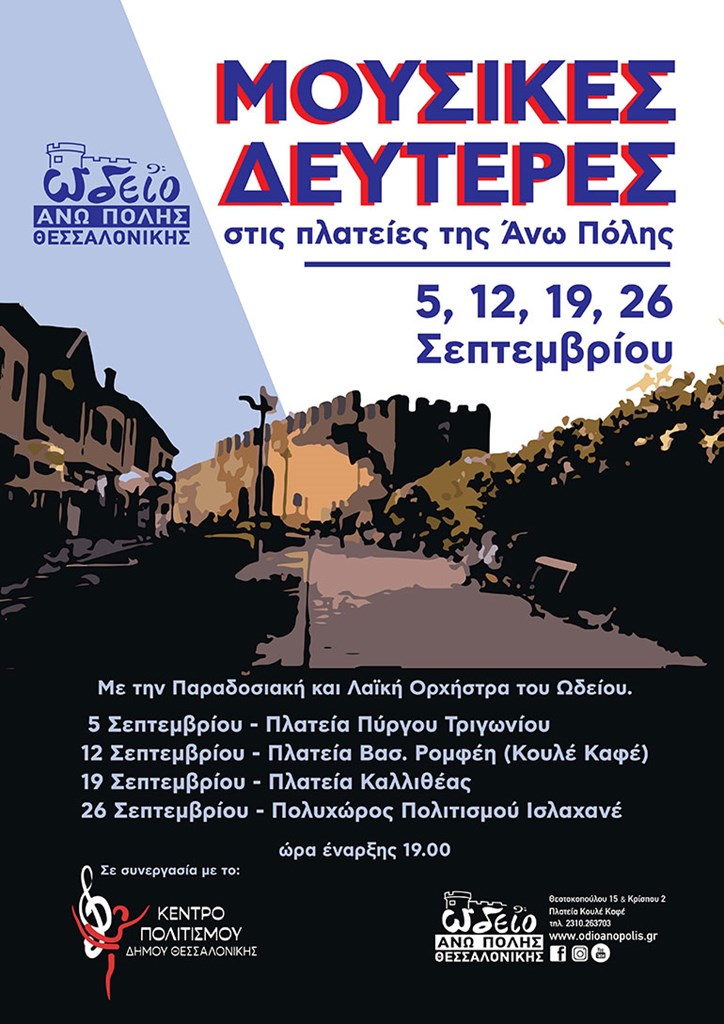 Υπαίθριες συναυλίες στις γραφικές πλατείες της Άνω Πόλης, με ελεύθερη είσοδο για το κοινό, θα πραγματοποιεί κάθε Δευτέρα του Σεπτεμβρίου το Ωδείο Άνω Πόλης, με τη συμμετοχή της Παραδοσιακής και Λαϊκής Ορχήστρας του, σε συνεργασία με το Κέντρο Πολιτισμού του Δήμου Θεσσαλονίκης.