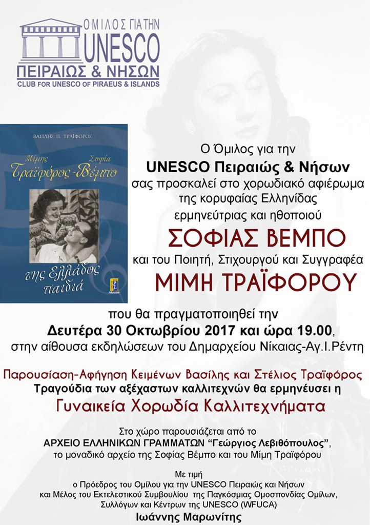 και τον ποιητή, στιχουργό και συγγραφέα Μίμη Τραϊφόρο θα πραγματοποιηθεί στις 30 Οκτωβρίου 2017 στις 19.00, στην Αίθουσα εκδηλώσεων του Δημαρχείου Νίκαιας-Αγ. Ι. Ρέντη.