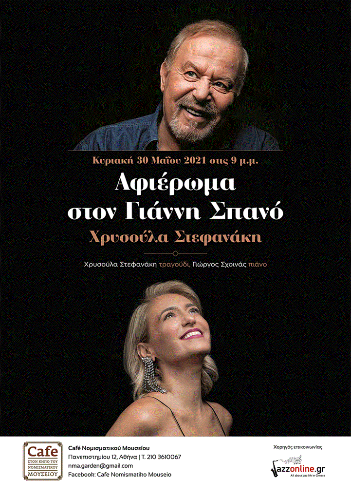 Κάποια από αυτά τα αγαπημένα κομμάτια και πολλά ακόμη θα ακούσουμε την Κυριακή 30 Μαΐου στις 9 μ.μ. στο café του Νομισματικού Μουσείου σε ένα εξαιρετικό αφιέρωμα που επιμελείται και παρουσιάζει η επί χρόνια συνεργάτιδα του ερμηνεύτρια Χρυσούλα Στεφανάκη με τη συνοδεία πιάνου από τον μουσικό Γιώργο Σχοινά.