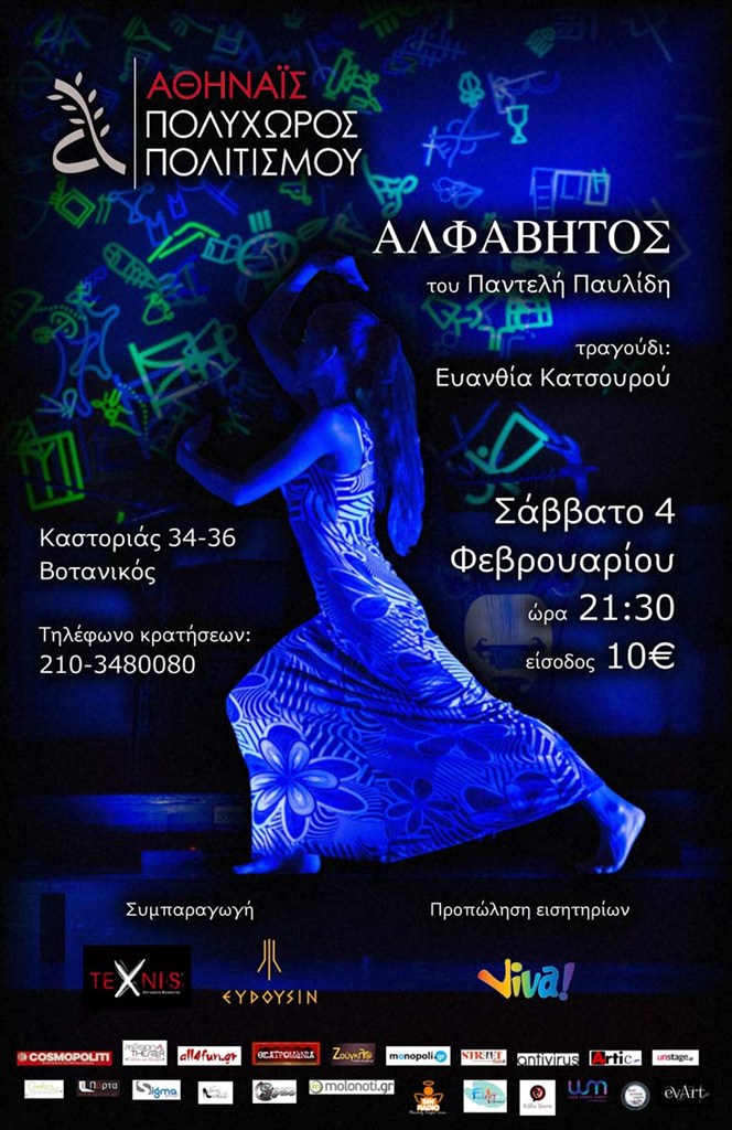 Δημιουργός και πειραματιστής της σύγχρονης Ελληνικής λαϊκής μουσικής τέχνης, ο Παντελής Παυλίδης επιστρέφει στα καλλιτεχνικά δρώμμενα της πρωτεύουσας με την καινούργια του δημιουργία «Αλφάβητος – Ήχοι Αιώνων», σε μία παράσταση που θα φιλοξενηθεί στον Πολυχώρο Πολιτισμού «Αθηναΐς».